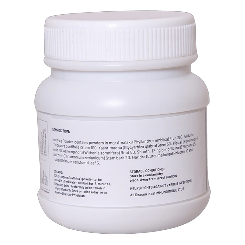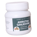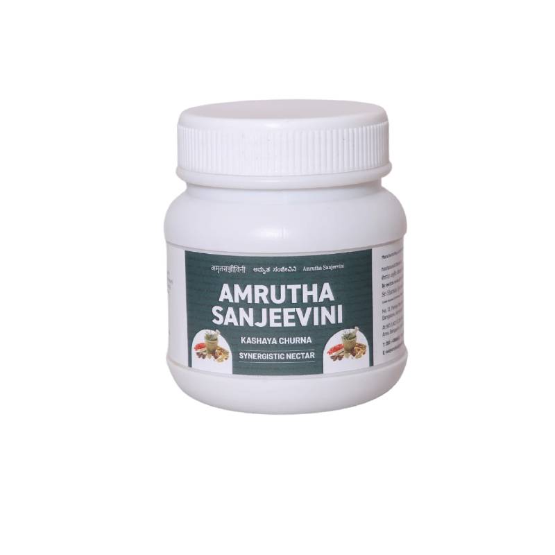 Amrutha Sanjeevani Kashaya Churna is an effective ayurvedic churna that combines the goodness of the Amritha (Guduchi) with other essential herbs ,available in the form of a fine powder. It is immune-modulator, very rich source of antioxidants and vitamin C. Due to its anti-inflammatory and analgesic properties, it is beneficial in treating Sandhivata (joint pain). When consumed with other medicines it works wonders in maintaining blood sugar levels. It balances the Tridosha (vata, kapha, and pitta), improves appetite, digestion and helps in attaining overall health during all seasons.